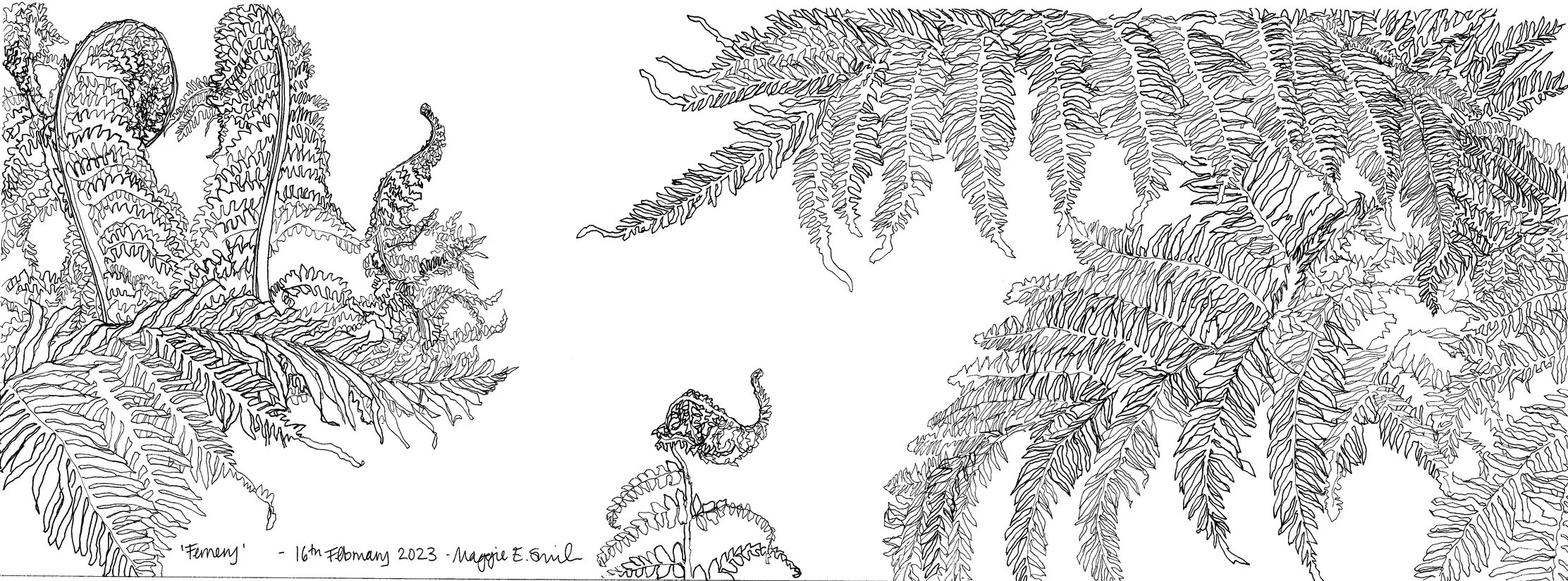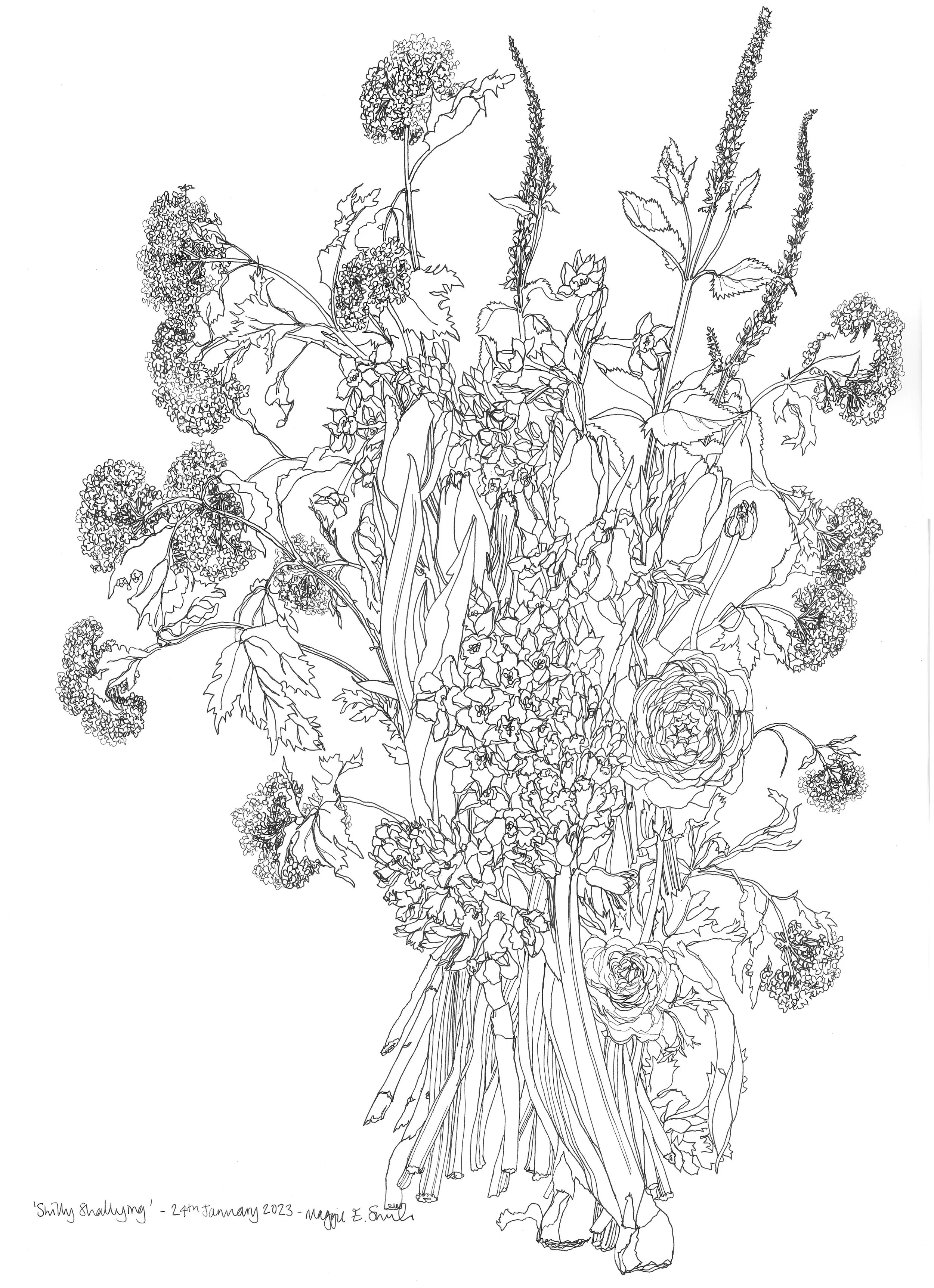 Maggie loves to draw outside in her Sussex garden and in the surrounding countryside, capturing the plants before her in ink pen on often very large sheets of paper. The weeds and wild flowers of the meadows, verges and seemingly innocuous plants and trees of woodlands fascinate her as much as the grander garden blooms.